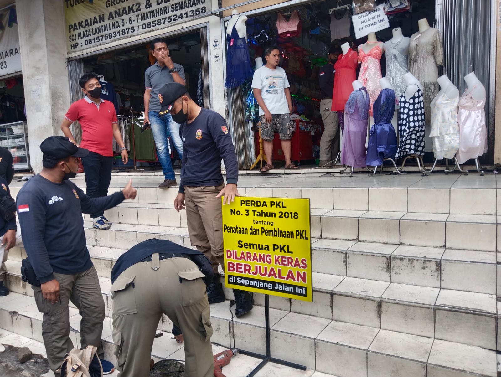 Petugas Gabungan Satpol PP Kota Semarang dan Dinas Perdagangan Kota Semarang memasang tiang pemberitahuan larangan dagang. Adapun 96 lapak pedagang sementara dipindah ke tepi Jembatan Johar di dekat konveksi, di Jalan Inspeksi.